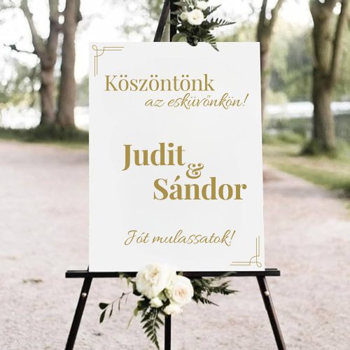 Esküvői köszöntő tábla elegáns arany felirattal és sarok díszítéssel